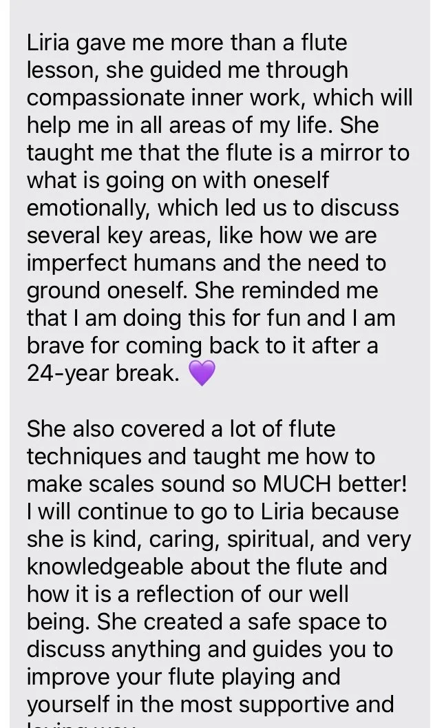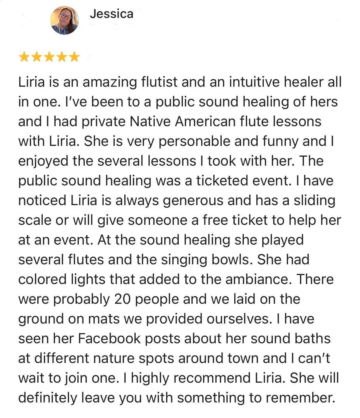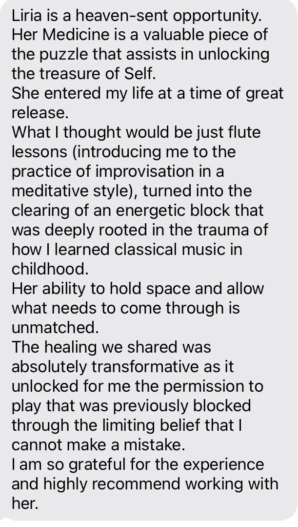 Liria is such a genuine soul. I felt so comfortable during our Reiki session and attend her Monday sound bath sessions where her flute playing drops me into a meditative state instantly.