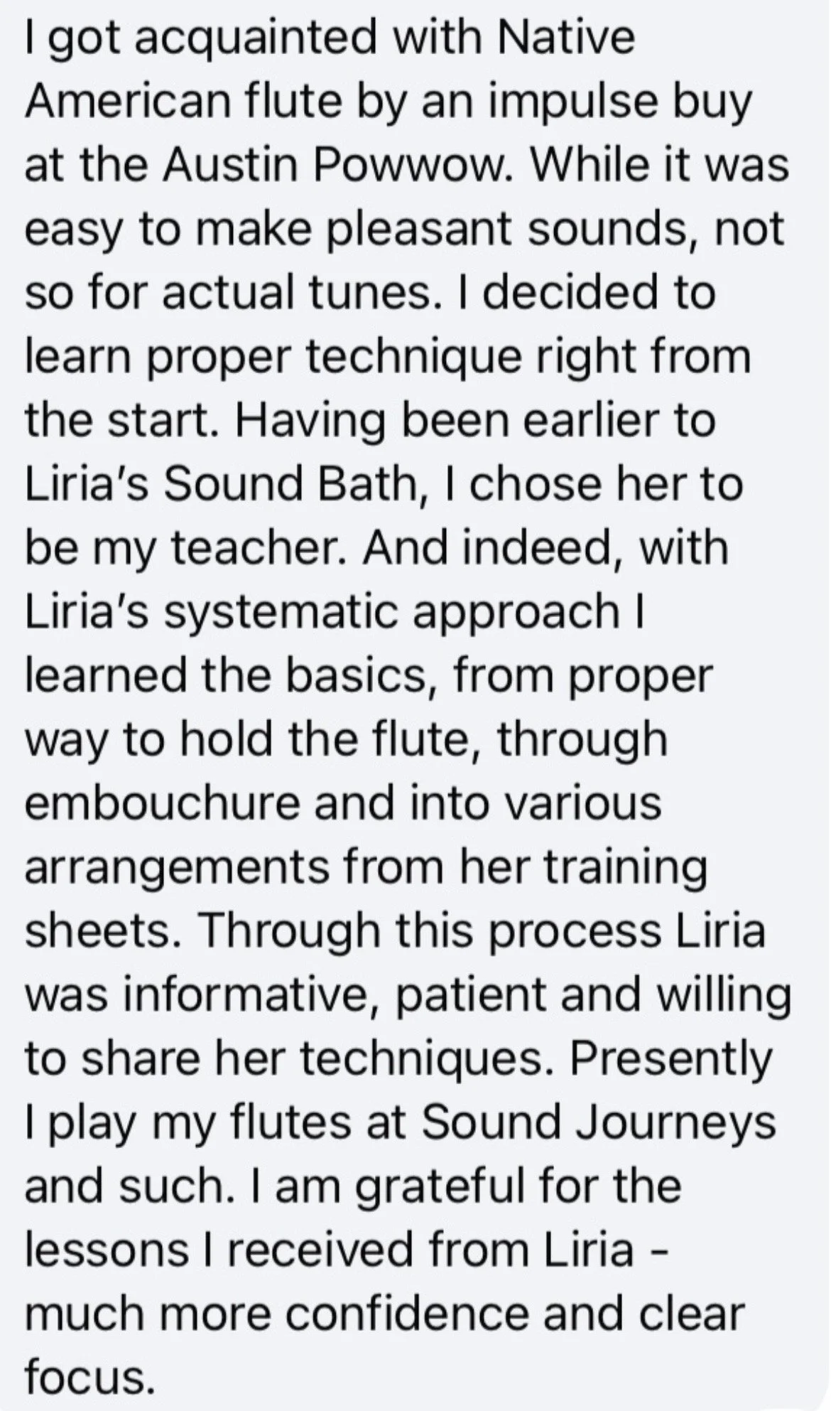 Over the past 5 years in Austin she has hosted 1000 sound baths, has her own Sound Healing Certification Program where she has trained over a dozen people to be sound healers, and now teaches adults how to play the Native Flute for peace and healing.